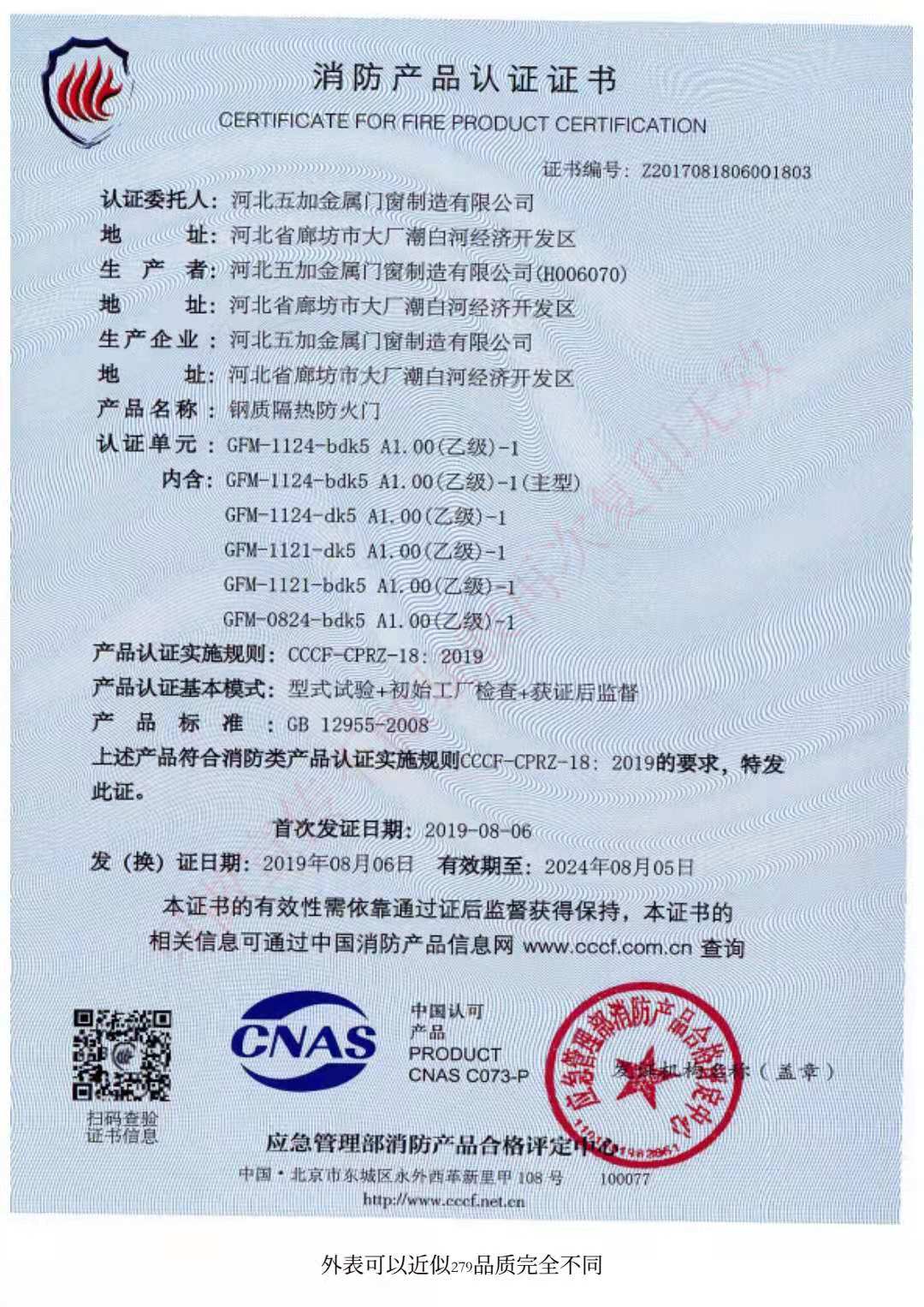鋼制防火門消防認證證書